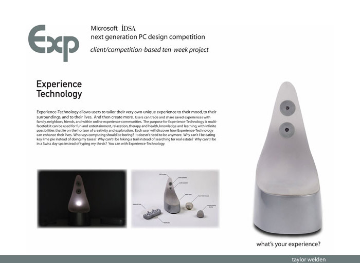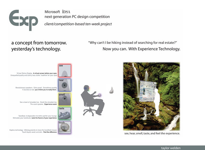 Experience Technology. Microsoft/IDSA next generation PC contest. Stimulate your senses. "Why can't I be outside instead of hunting for real estate?" "Why can't I be eating key lime rather than do the family taxes?" Now you can. What's your experience?